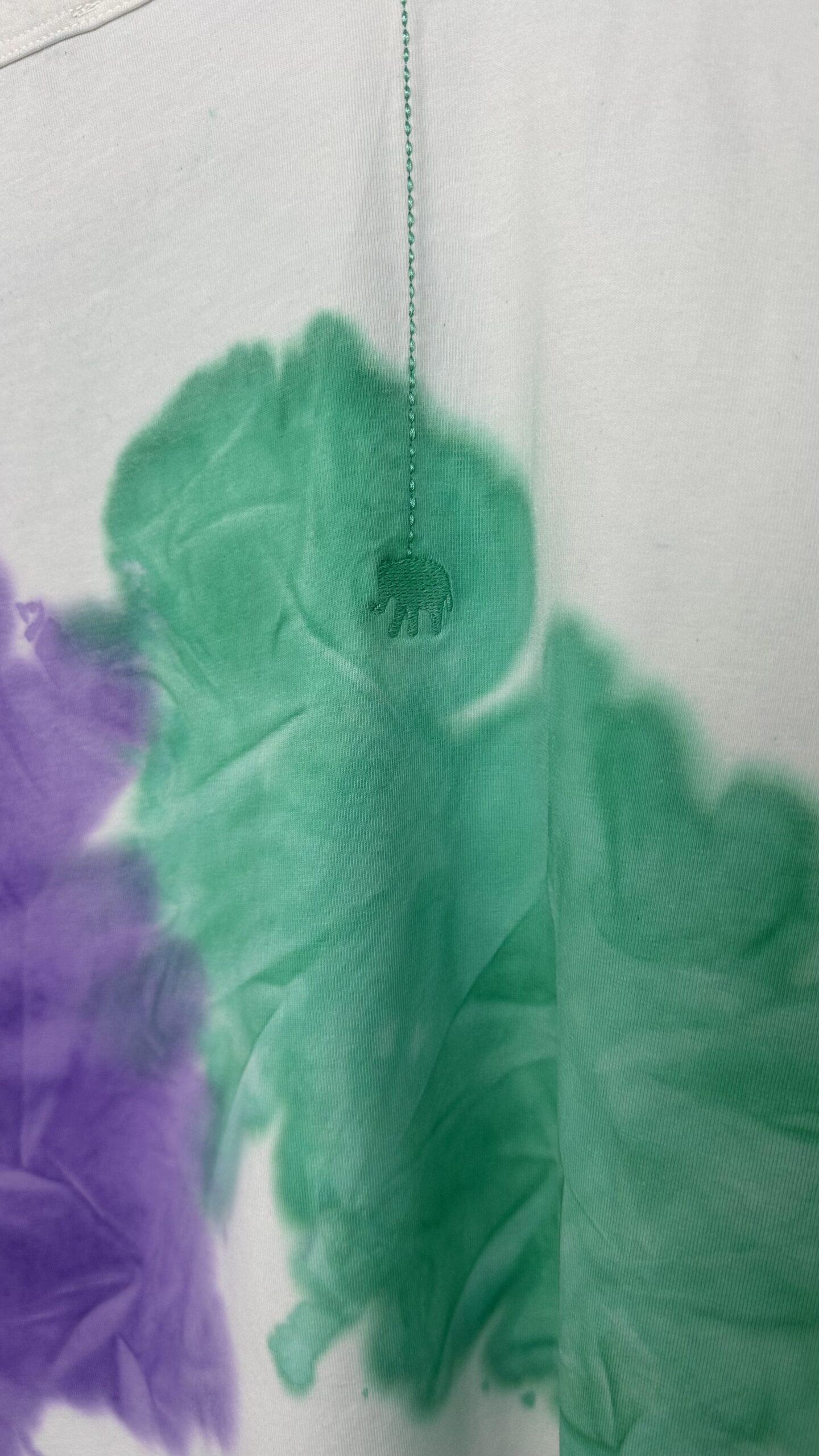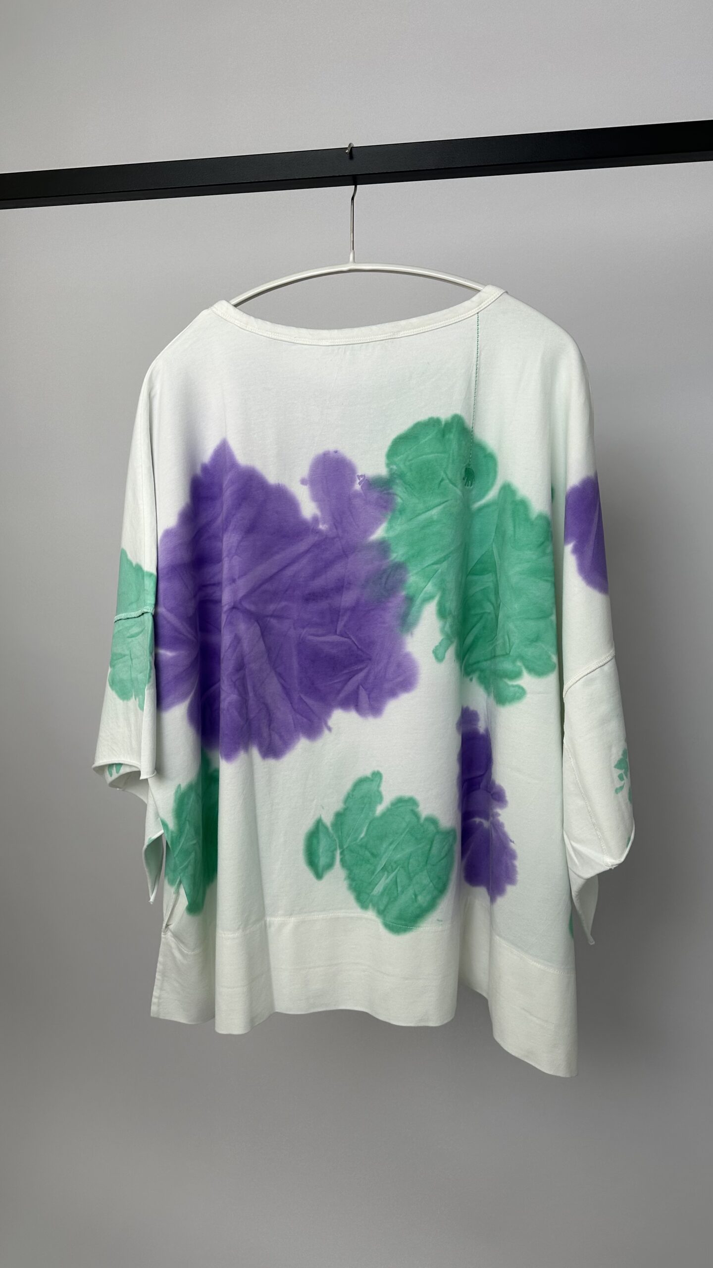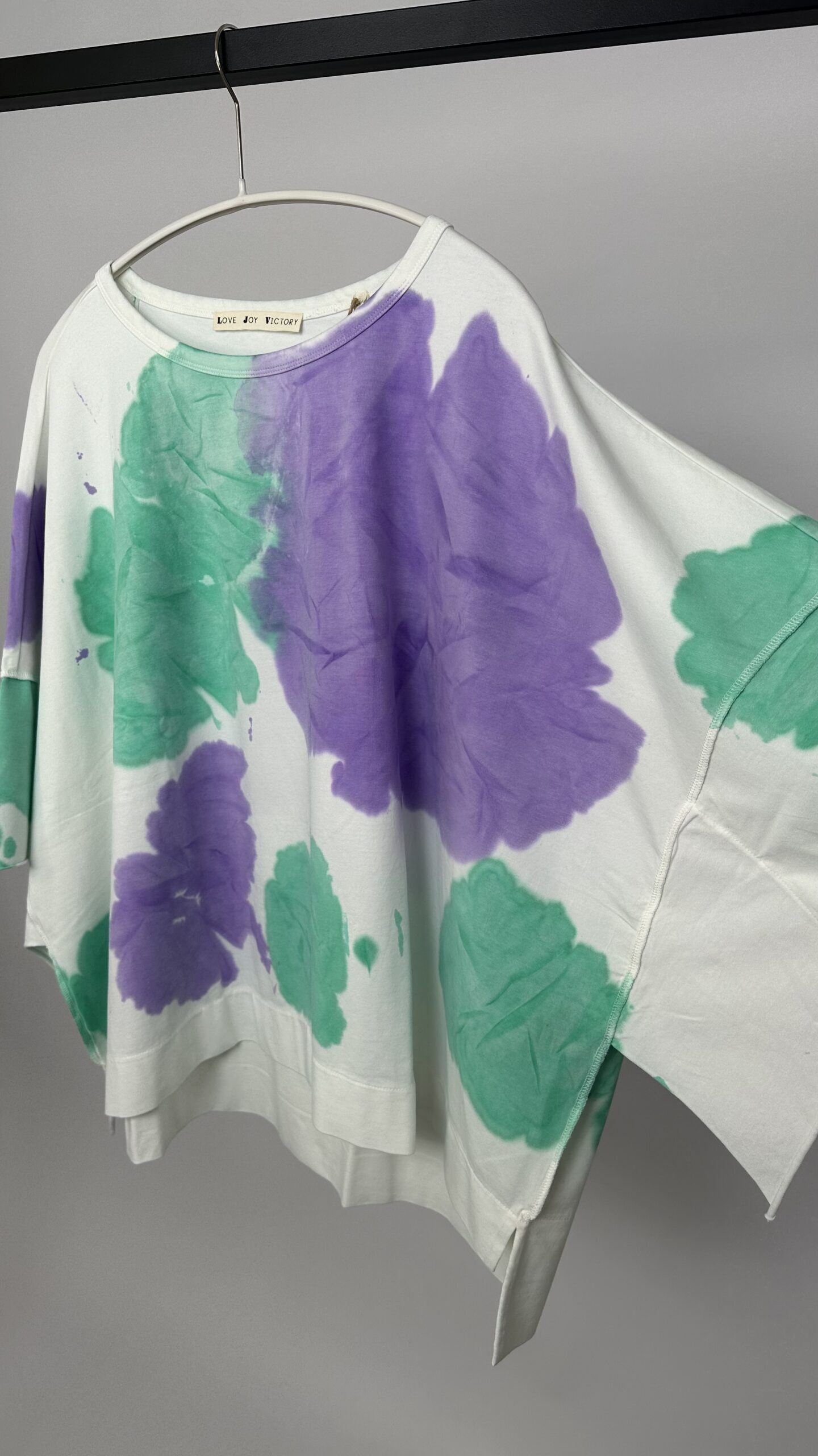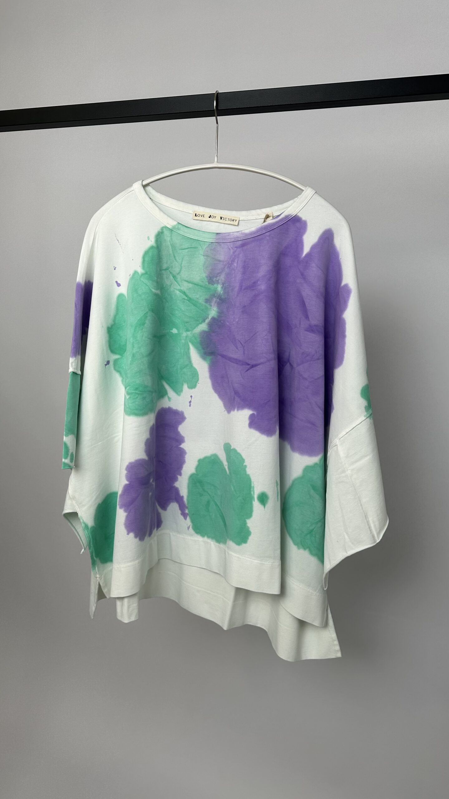T-Shirt von LOVE JOY VICTORY in einzigartiger Batik-Optik. Das T-Shirt hat einen festen, elastischen Jerseystoff, einen Rundhalsausschnitt, eine 3/4-Armlänge, einen Schlitz am Saum und ist hinten länger geschnitten. Kleine Elefant-Stickerei auf der rechten Rückseite. Dank des Materials wundervoll zu tragen – ein echtes Wohlfühl-Teil!